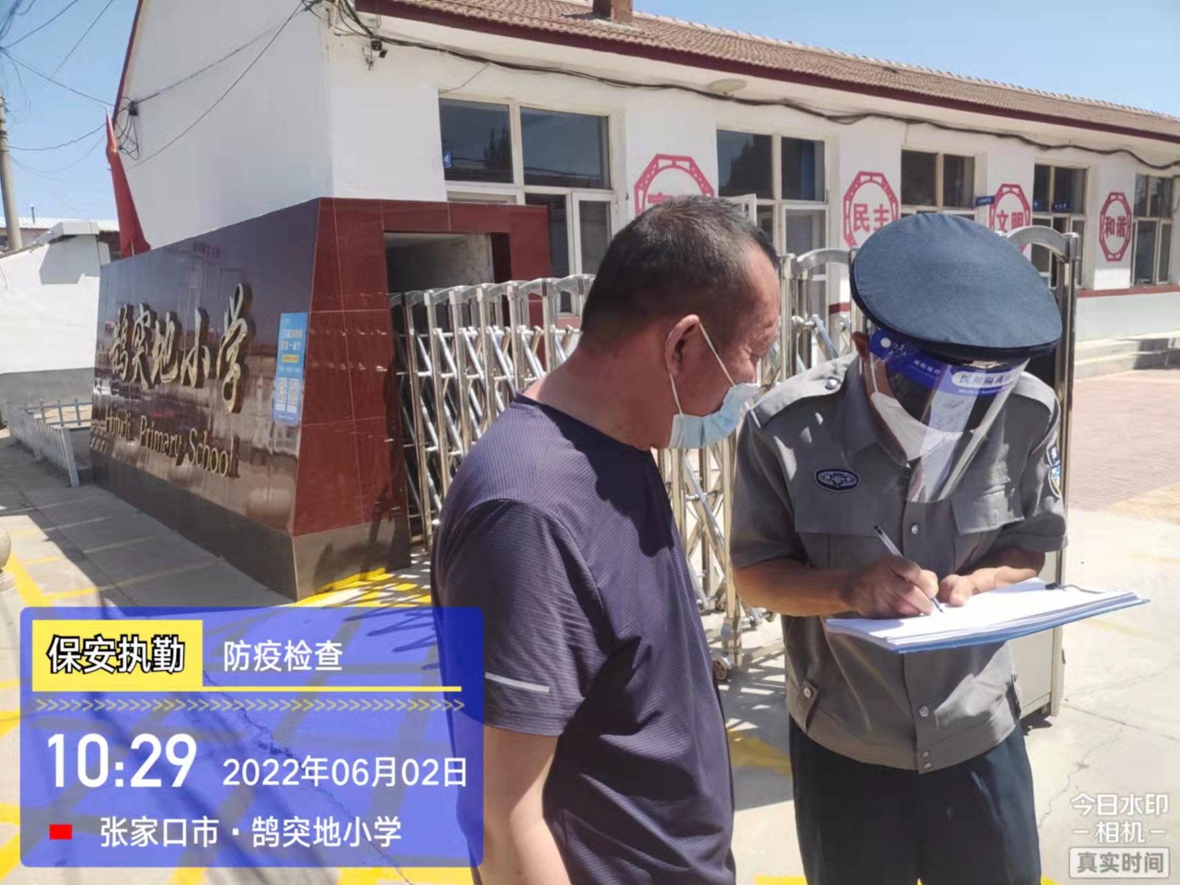 會后,我公司迅速召開“疫情期間學校門衛(wèi)安全防控工作要求”的會議,制定了校園安全防疫規(guī)定:疫情防控期間,校園保安隊員必須穿制服,規(guī)范佩戴“三件套”(防護隔離面罩、N95口罩、一次性PVC手套);進出校園的師生必須測量體溫,外來人員需登記、測溫、掃碼(幸福張家口,呈綠碼)、且持7日內(nèi)核酸陰性檢測結(jié)果;保安室需保持干凈整潔,物品擺放有序,勤開窗通風,定期噴灑消毒藥水。為此,公司特成立校園防疫檢查小組,由副經(jīng)理帶隊,協(xié)同主管大隊長對經(jīng)開區(qū)所有中小學校安保崗位進行防疫工作檢查,檢查期間,發(fā)現(xiàn)問題,現(xiàn)場處理,并及時與校方領(lǐng)導溝通,杜絕同樣問題再次出現(xiàn),確保校園防疫安保工作萬無一失,為各校師生鑄就一道安全防線!